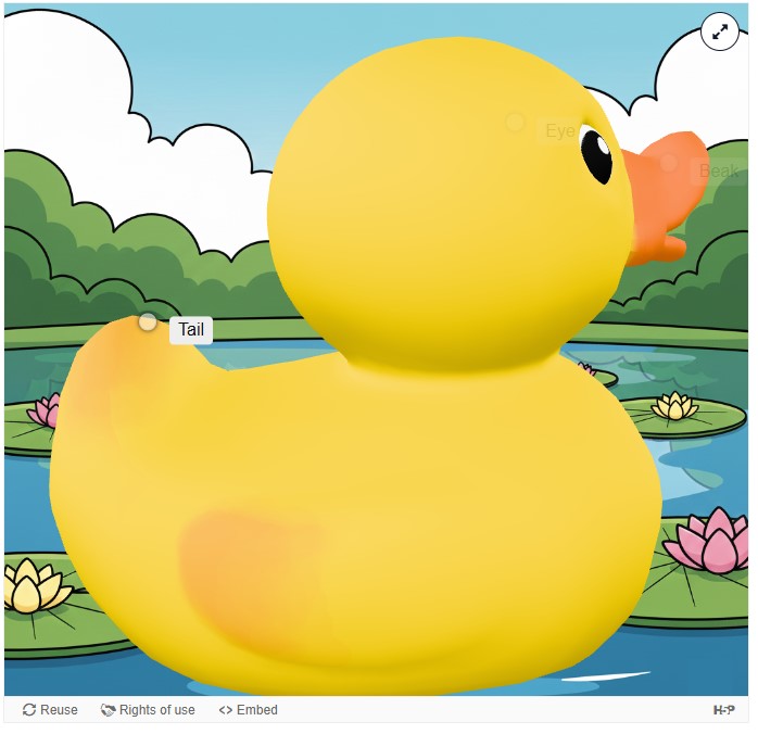 É um pouco familiar, não é? Podes adicionar hotspots, atribuir-lhes texto, imagens, áudios e vídeo. E eles aparecem num overlay. Ah, e talvez tenhas reparado que podes adicionar uma imagem de fundo atrás do modelo. O que seria de um pato sem um lago para chapinhar?